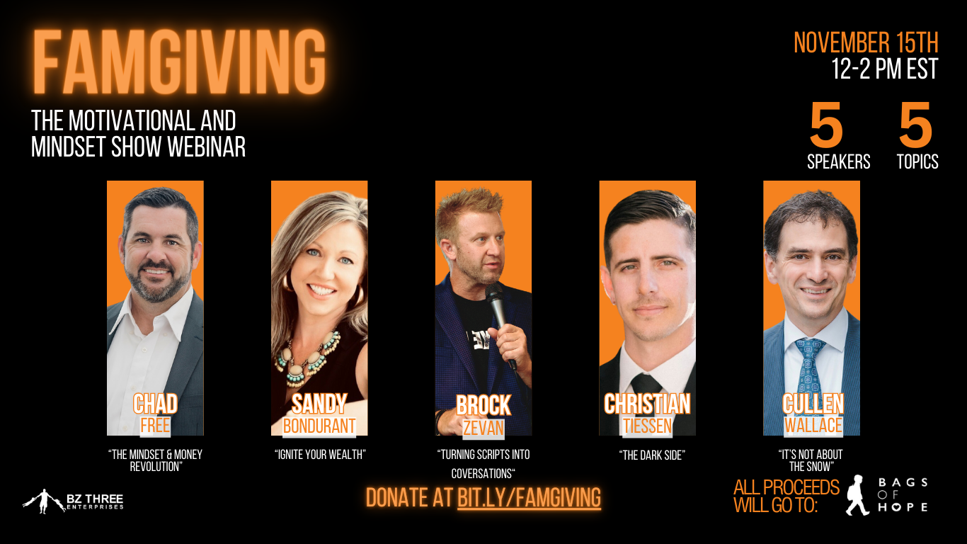 Join us for an extraordinary Famgiving event where you can both enrich your knowledge and make a real difference through Bags of Hope charity. Register now to embark on a transformative journey covering topics like "the mindset & money revolution" to supercharge your financial well-being, "ignite your wealth" to unlock your true potential, and "turning scripts into conversations" for powerful communication skills. Delve into "the dark side" and realize that "it's not about the snow" as we encourage you to give back this season. Secure your spot, donate, and remember, all proceeds will go to Bags of Hope, making your participation even more impactful!